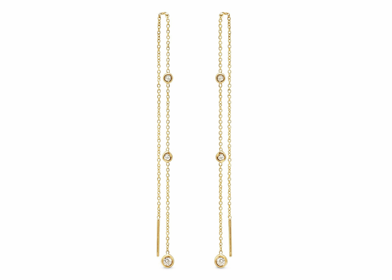 Made of gold plated flashed fine 925 sterling silver. These Threader Earrings are set with 6 round cut clear cubic zirconia in bezel setting.