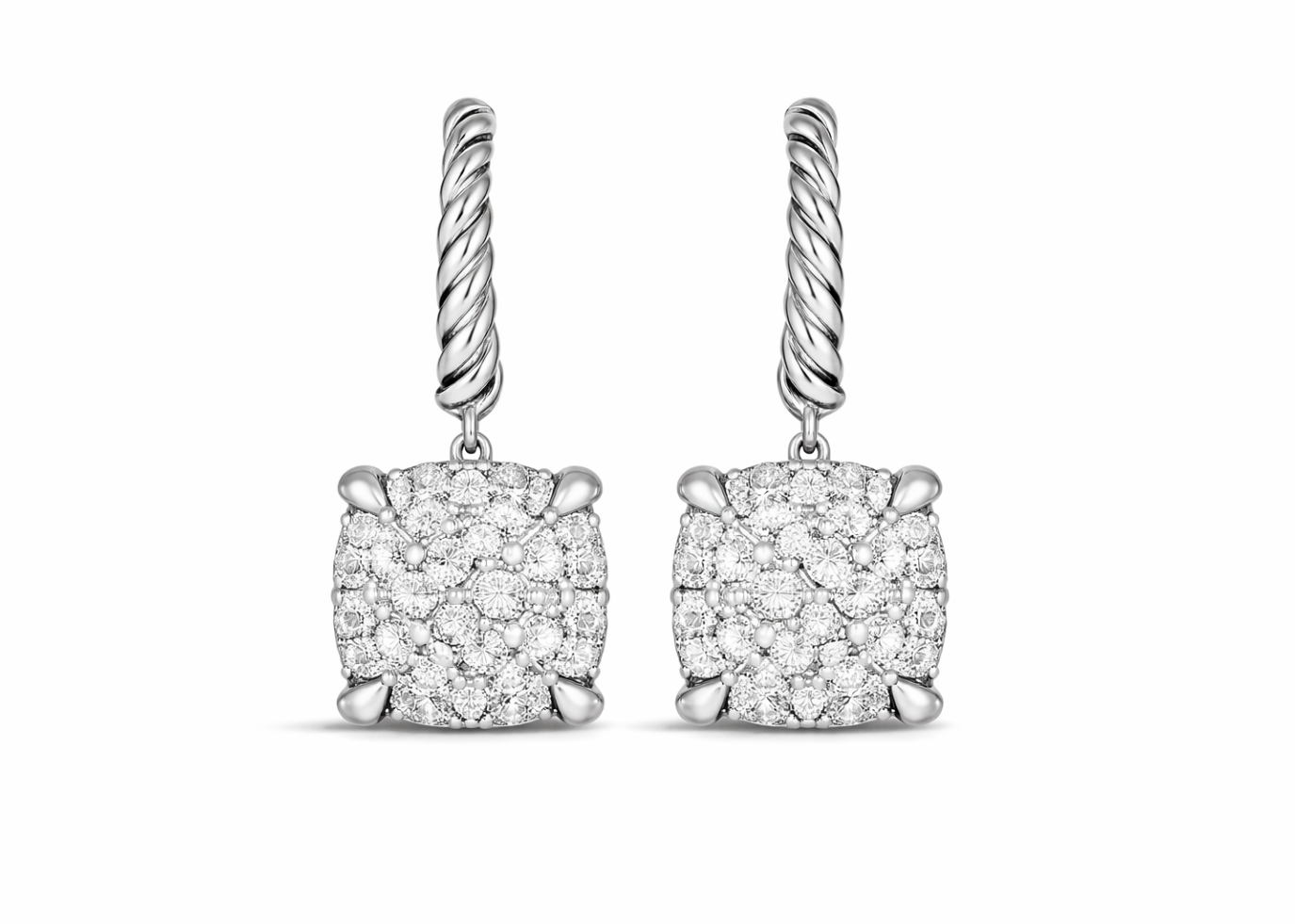 Rhodium Plated CZ Studded Square Shape Twisted Earring, with 22 MM High Polish Finish, set in 14 KT, weighing approx 5.50 grams