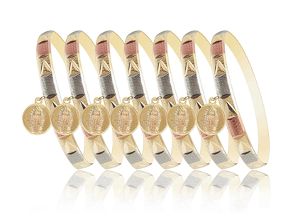Mother Mary Charm Bangle with Three Tone Plating measuring 6 mm in width and 12 mm of Mother Mary Charm weighing approx 10.8 grams per piece with High Polish Finish