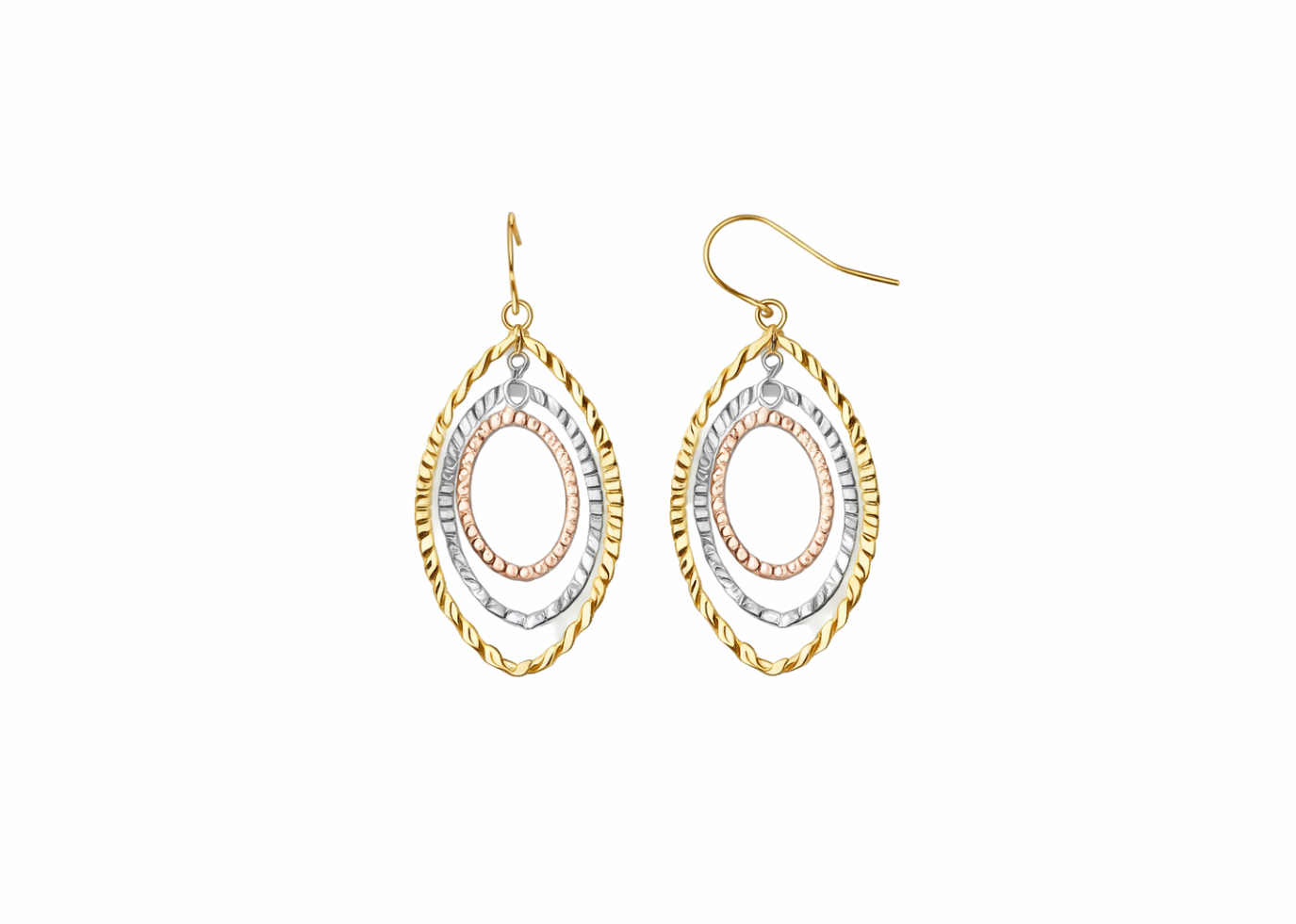 Enhance your everyday style with these Three Tone Plated Chandelier Earrings, featuring a sleek 20 mm design and elegant high-polish finish. Crafted with 14kt three-tone gold plating and a lightweight 10.3-gram build, these earrings offer a refined balance of modern fashion and timeless elegance, perfect for both casual and occasion wear.