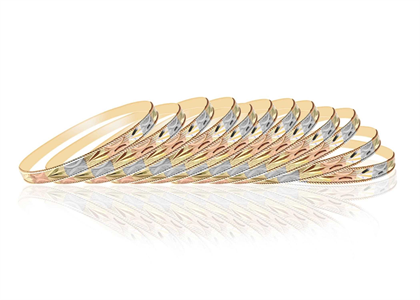 Three Tone Plated side veni Bangle of 6.5 mm 14 kt 3 Tone Gold Plated Bangle in ALL SIZE # 1 TO # 8 of Approx 15.12 grams with High Polish finish Sold as a set of 12 pc